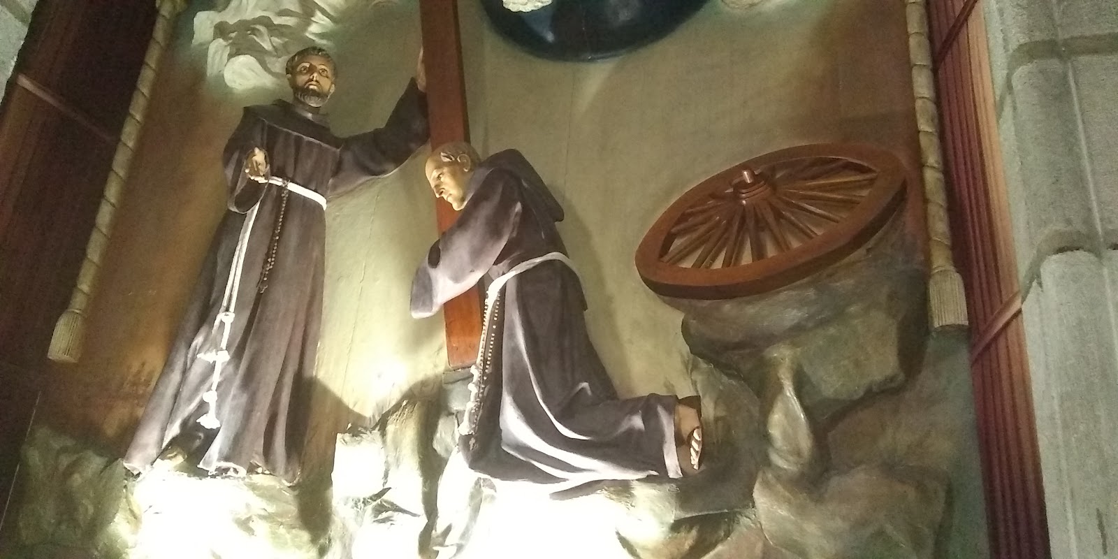 Aquí se ve al beato Sebastián de Aparicio arrodillado ante San Francisco de pie.